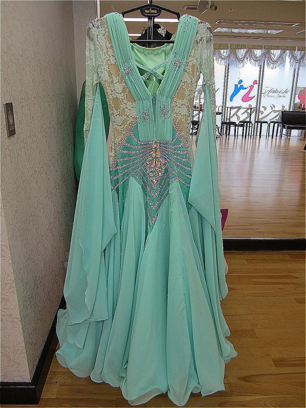 ミントグリーンで様々な生地を使った素敵なドレスです。
