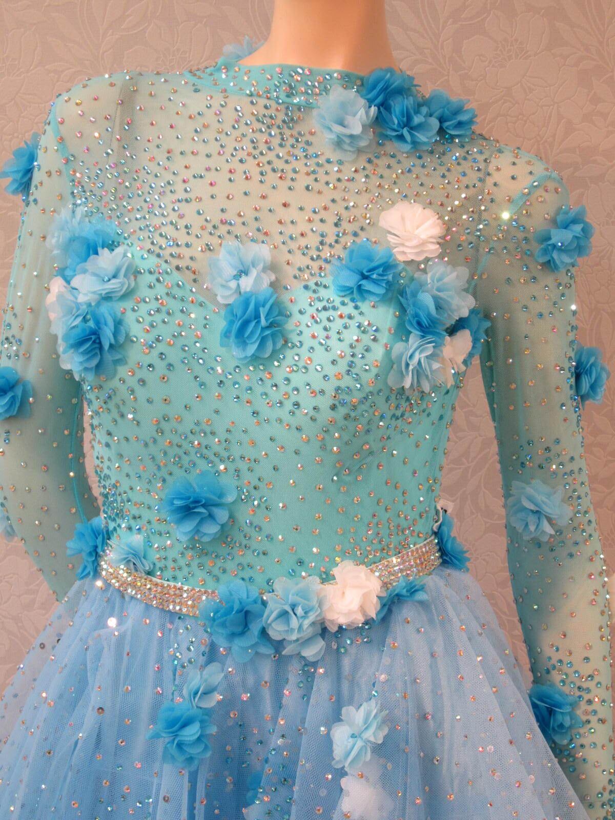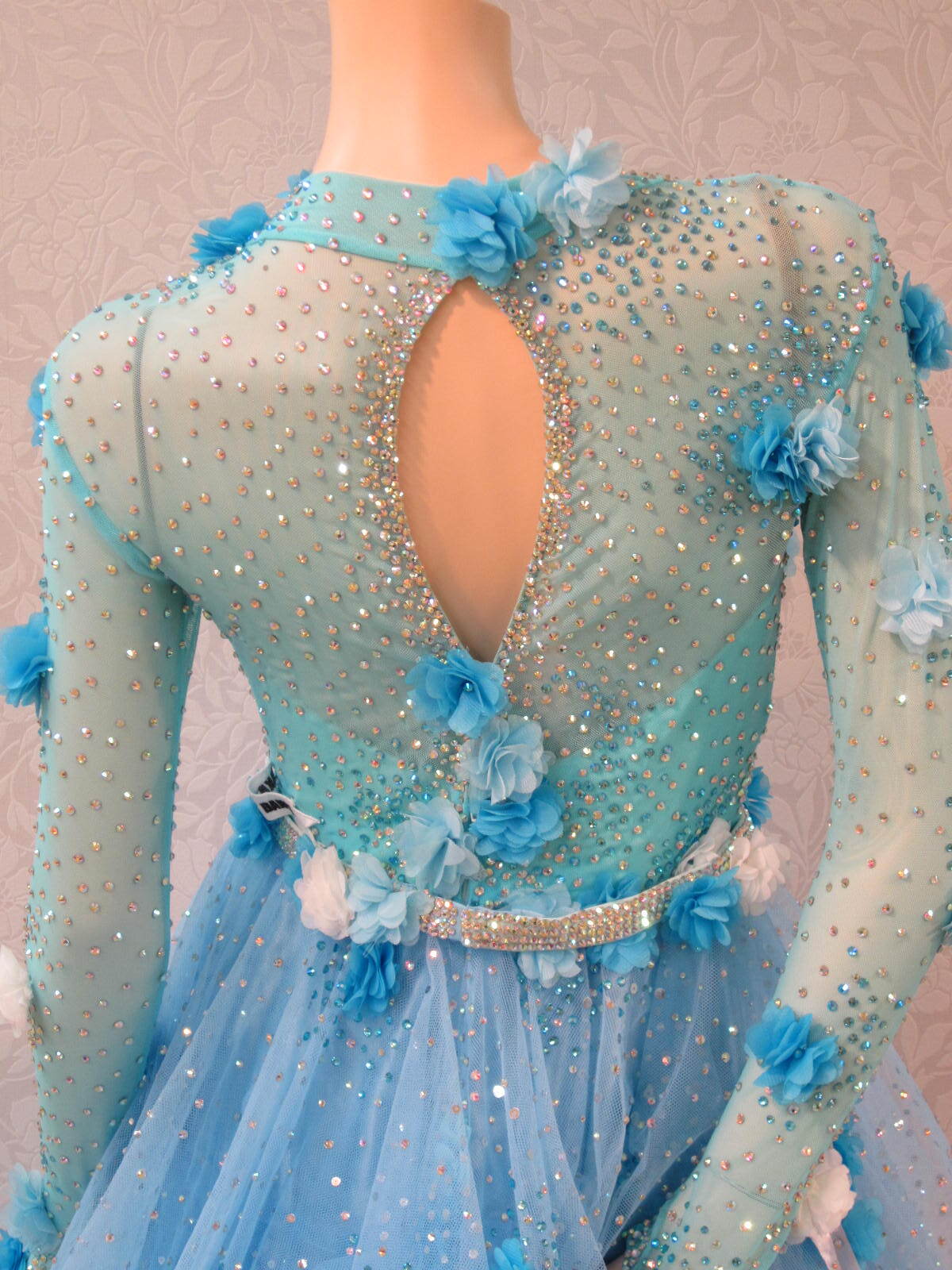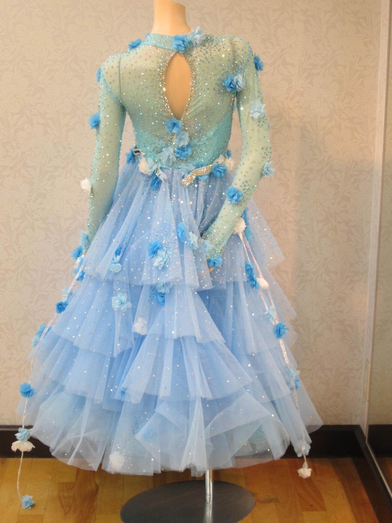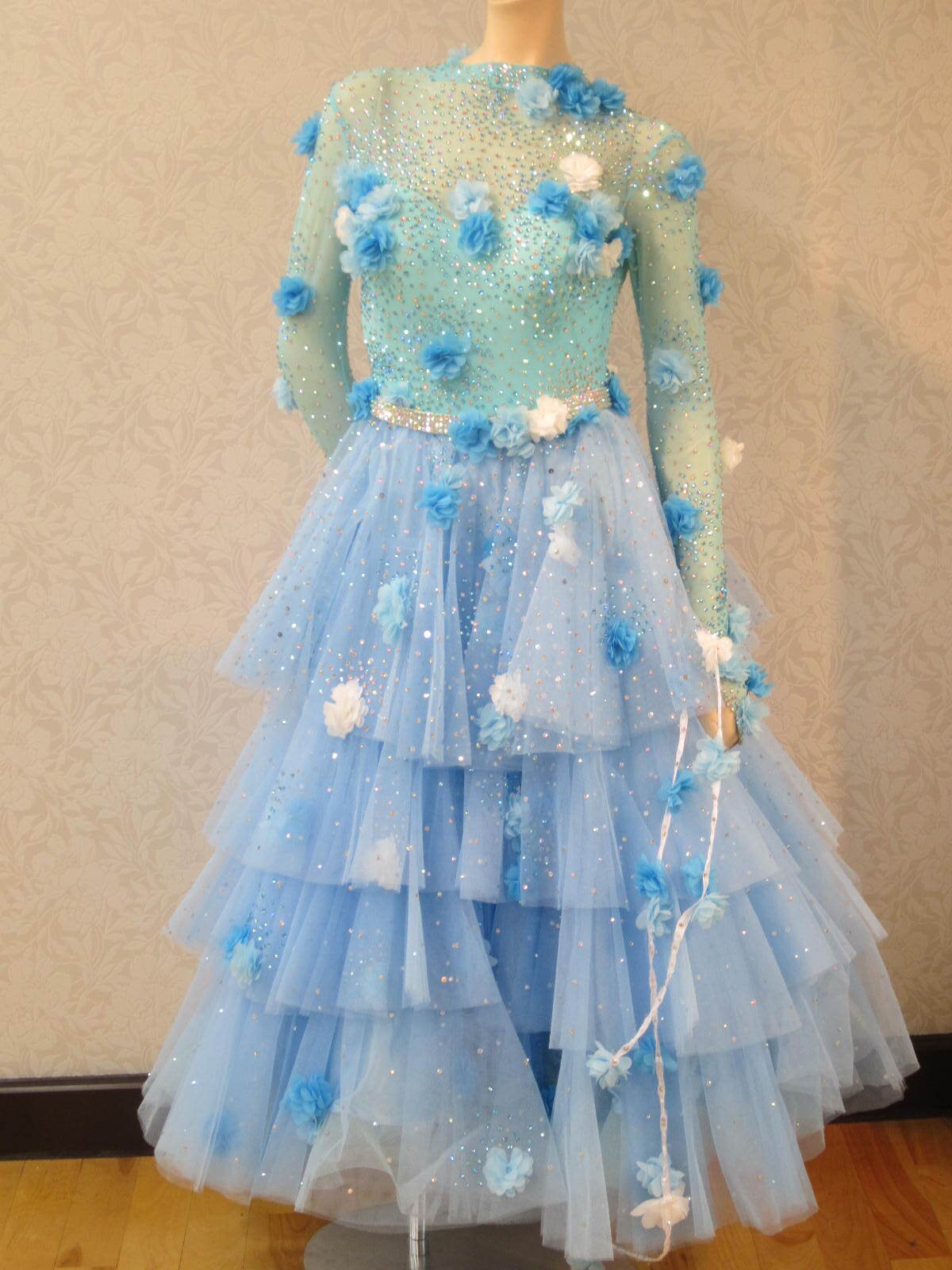 水色のドレスですが、下がチュールの4段になっていて、全体にストーンを散りばめております。小花で全体に装飾しているドレスです。