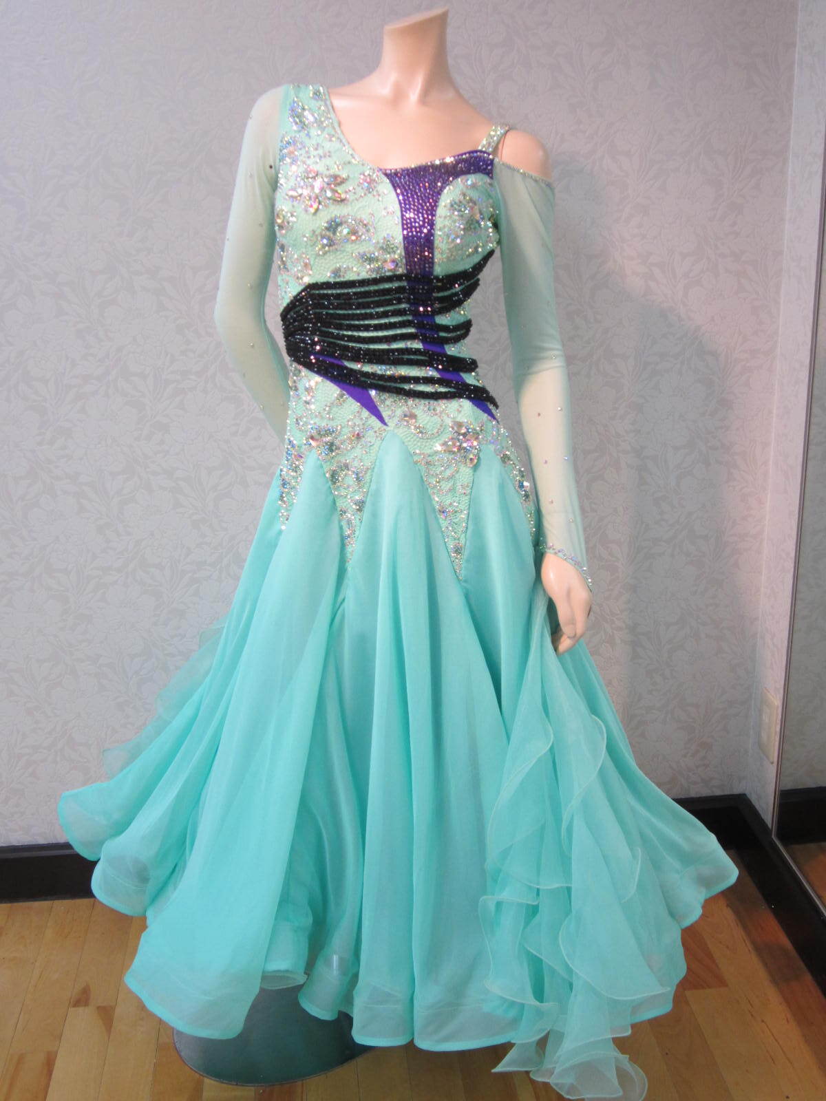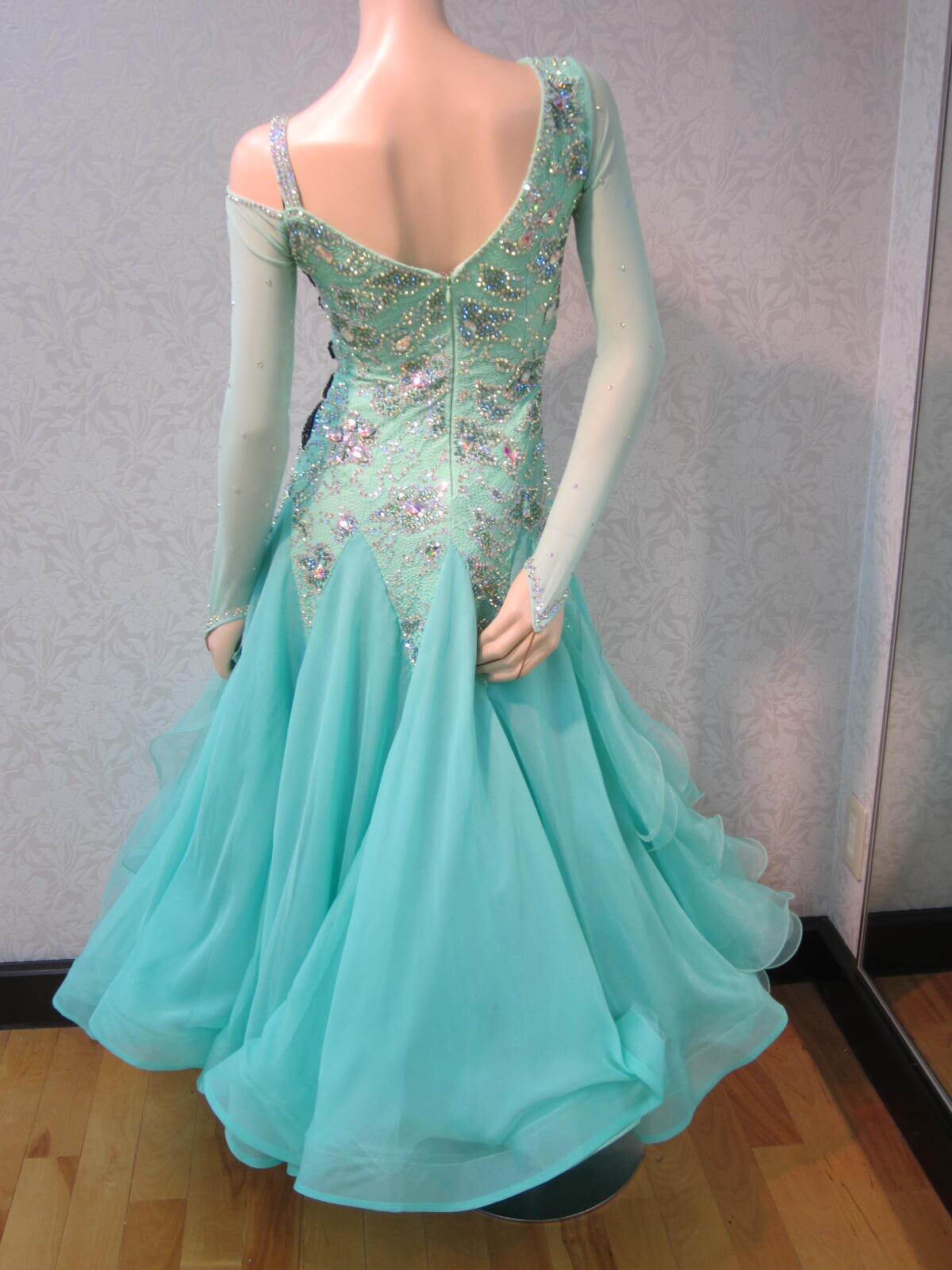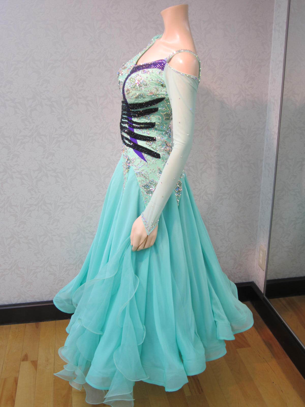ミントグリーンにウエストに黒い紐が付いて、シャープなデザインになっております。