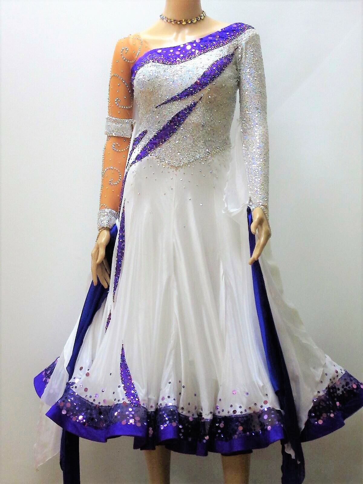 パールホワイトにパープルのラインが入ったスタンダードドレス、Mサイズです。