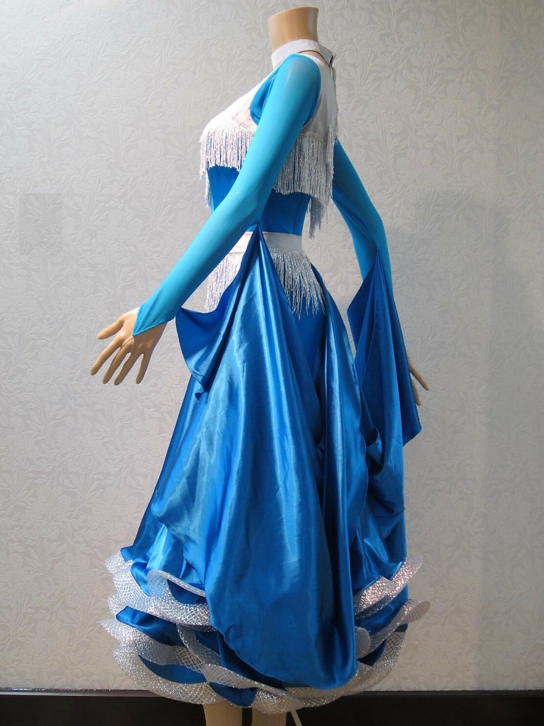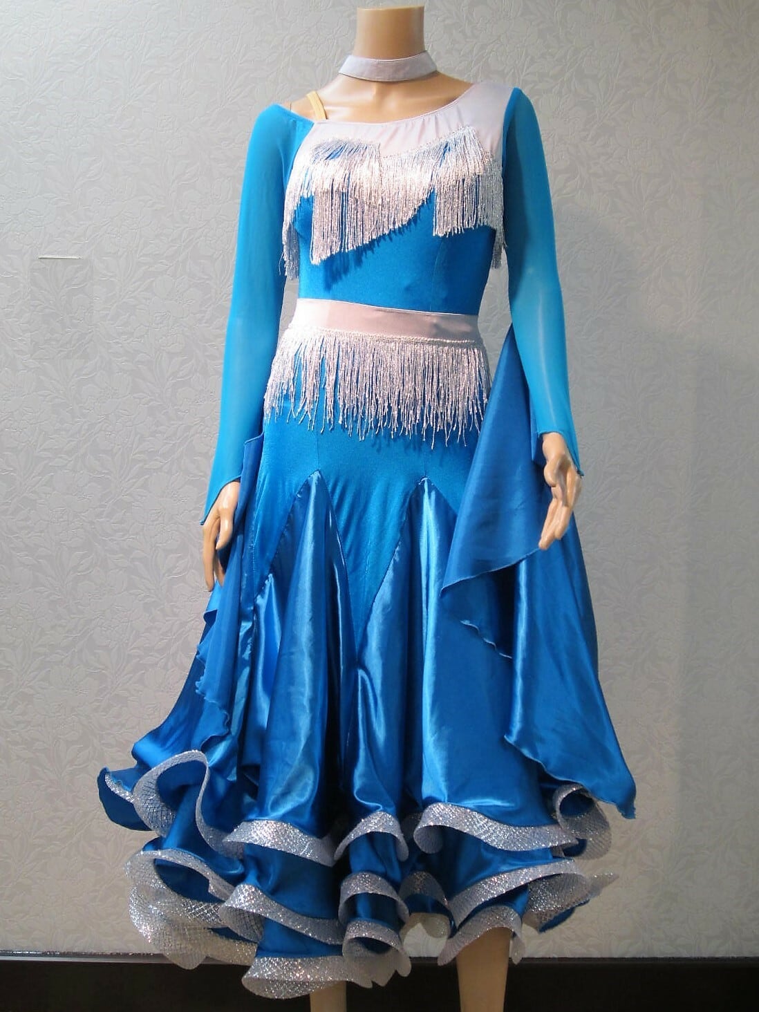 スカイブルーにシルバーのフリンジがついたスタンダードドレスMLサイズです。
