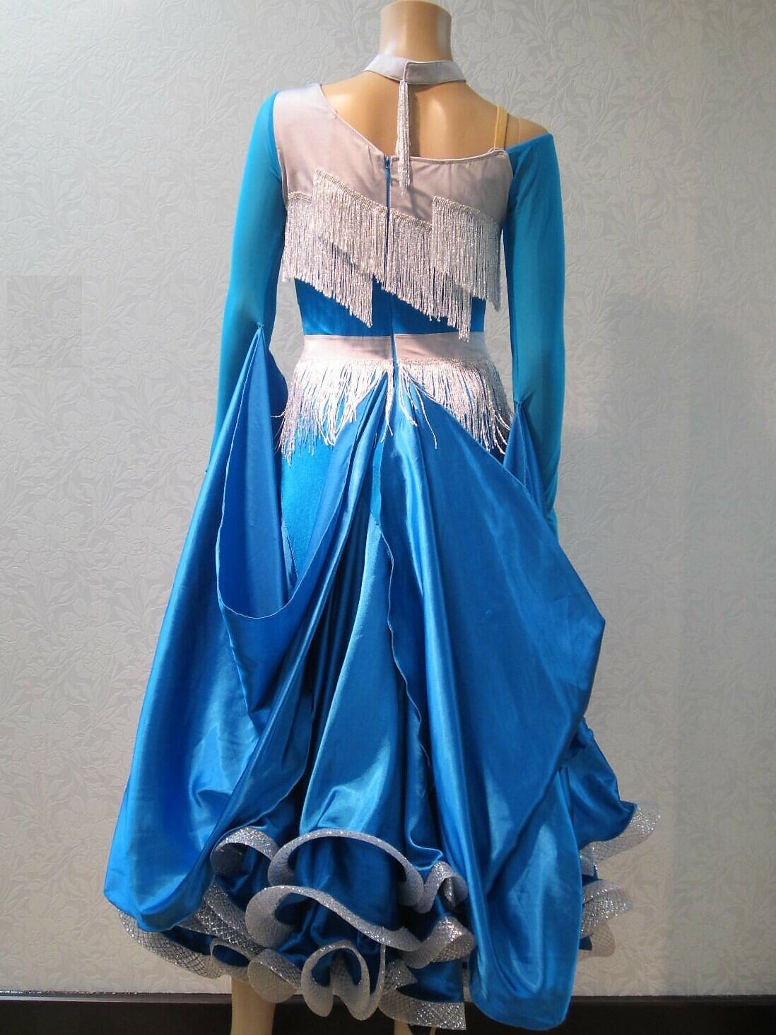 スカイブルーにシルバーのフリンジがついたスタンダードドレスMLサイズです。