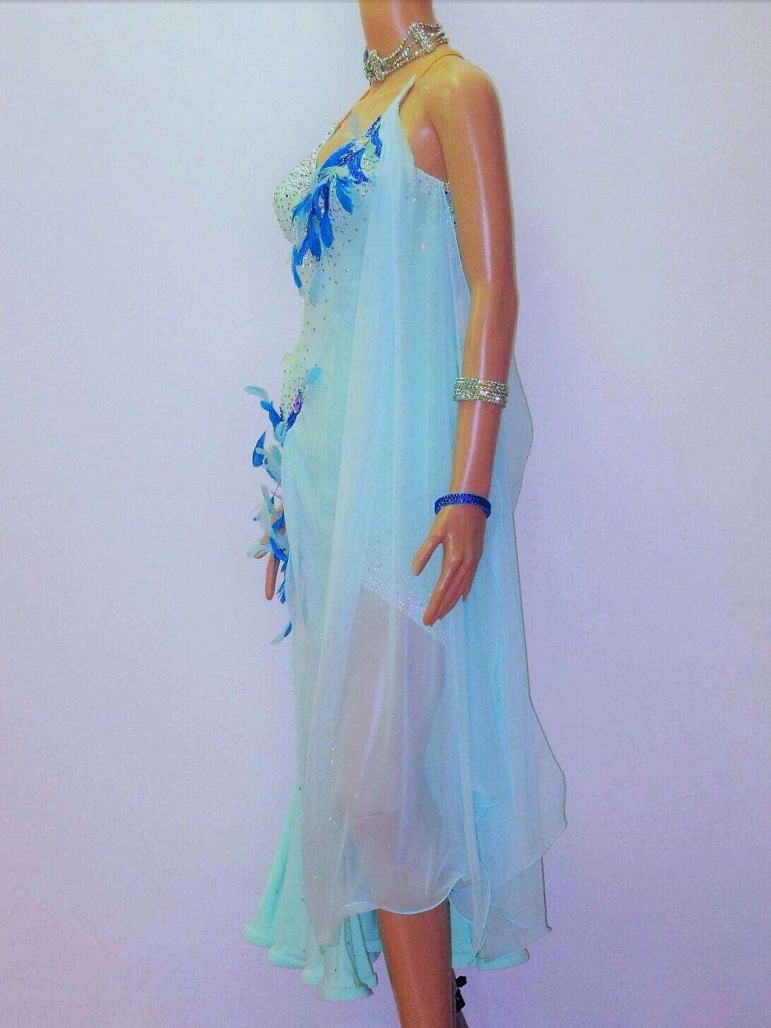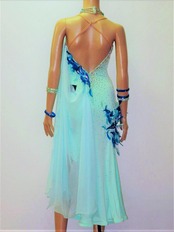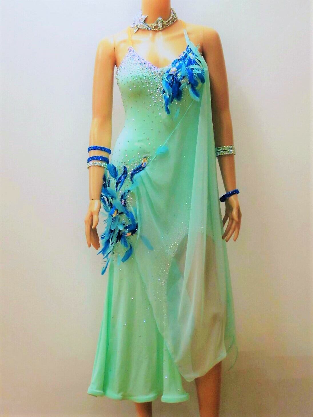 ミントグリーンにブルーの羽根が付いたラテンドレスSMサイズです。